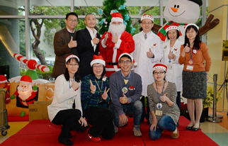 | 江伯倫副院長、兒童醫院吳美環院長、公益團體代表、 企劃管理部同仁和聖誕老公公一同為小朋友送上祝福 |