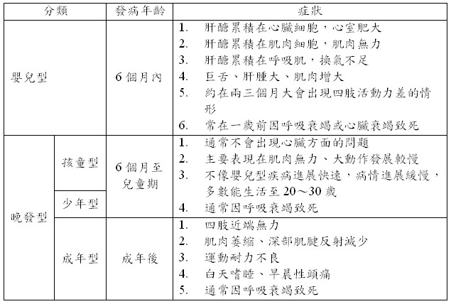 雖然嬰兒一出生就帶有該疾病,但根據發病年齡與對器官的影響,可分為嬰兒型及晚發型,其中晚發型又可細分為孩童型、少年型及成年型,用以下表格來簡單介紹。