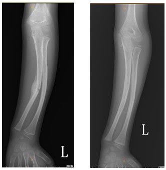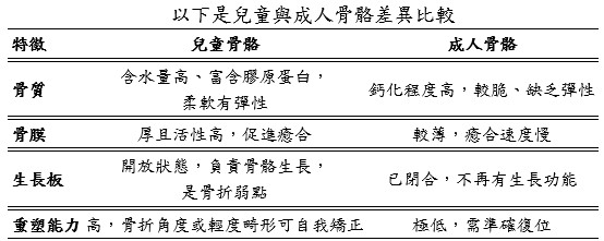 | 兒童活潑好動,在日常生活中常因奔跑或運動不慎跌倒受傷。當孩子突然大哭、無法活動肢體時,家長往往擔心是否骨折,甚或會影響孩子未來的發育。常見的受傷情境包括:遊樂場、騎單車或滑板車摔倒,甚至車禍造成嚴重創傷。雖然這些骨折看似驚恐,但只要儘早就醫,依照醫師建議選擇合適的治療,因兒童骨骼癒合力強,多數都能順利康復。本文章將協助家長了解兒童骨骼的特性、骨折後的應對方式與治療選擇,術後照護與復健,希望幫助孩子在安全、正確的醫療照護下健康成長,重拾自信活力。 兒童骨骼的特性與骨折風險 兒童的骨骼與成人堅硬的骨質相比,兒童骨骼較柔軟有彈性。因骨質尚未完全鈣化,較小的外力就可能造成骨骼彎曲或骨折。根據研究顯示,在18歲以前,約有50%的男孩與30%的女孩會經歷至少一次骨折。幸運的是,相較於成人骨折往往需3~6個月癒合,兒童通常僅需4~6週即可癒合,且石膏固定時間也大多在3~6週內,顯示出兒童骨骼強大的修復與塑形能力[圖一]。兒童骨骼骨膜較厚、含豐富膠原蛋白,這些都是促進癒合的有利條件。不過,兒童骨骼兩端存在尚未閉合的「生長板」,這是控制骨骼長度與形狀的重要部位。一旦生長板受損,可能造成骨骼彎曲、手腳長短或關節變形等後遺症。因此,若懷疑骨折波及生長板,需由專業醫師詳細評估與追蹤治療,以確保孩子未來的正常發育。