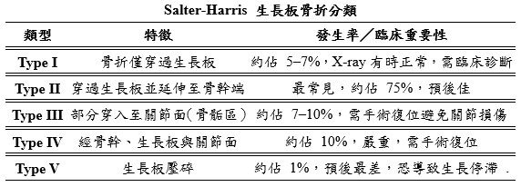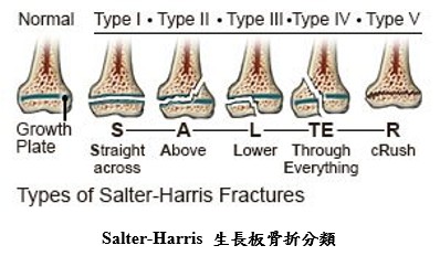 生長板骨折 Salter Harris分類法 生長板是位於兒童長骨兩端的特殊軟骨組織,負責控制骨骼的成長方向與長度。與具有緩衝作用的成人關節軟骨不同,生長板是透過軟骨細胞的分裂與增生,逐漸推進骨骼的延長與發育。隨著青春期的到來,生長板會逐步鈣化並最終閉合,意味著骨骼生長趨於成熟。通常,女孩的生長板在約14歲左右閉合,男孩則多在16歲左右結束骨骼成長。生長板骨折(physeal fracture)若未妥善治療,可能導致一系列骨骼生長與關節發育的後遺症,故了解其受傷分類與處置原則至關重要。