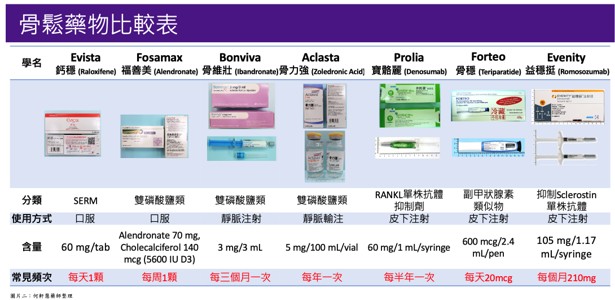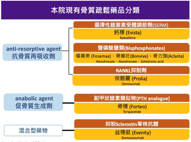 - 雙磷酸鹽類(Bisphosphonates):Alendronate(福善美;Fosamax®)、Ibandronate Sodium(骨維壯;Bonviva®)、Zoledronic acid(骨力強;Aclasta®)。