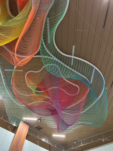西班牙裔藝術家 Inés Esnal 創作的《讓自然成為撫慰》懸掛於健康大樓挑高大廳,靈感源自自然界的色調,由14種上色珠鍊構成的流動曲線,涵蓋從明亮黃橙到深邃藍綠的漸層,整體色彩繽紛活潑,藝術家巧妙運用暖色與冷色的對比:暖橙黃調帶來溫暖活力,冷綠藍調則傳遞平靜與安全感。亮橙、溫黃、柔綠和寧靜的天藍,使人聯想起日出、森林與陽光等自然元素,同時也呼應了空間中作品《律動的風景》的創作主題。整體而言,《讓自然成為撫慰》透過彩色線條和曲線造型,營造出有機整體感,悄然讓觀者感受到被自然包覆的溫柔力量,達成視覺上、心理上的舒壓效果。