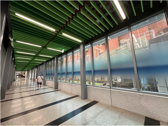這兩件作品不僅在視覺上引人入勝,其佈局也仔細考量了空間的屬性。《讓自然成為撫慰》以懸吊裝置創造視覺焦點與空間開展,適合公共大廳這類人流密集、需要快速安撫情緒的場域;而《海邊的房間》則以漸層色彩與自然光交織,適合長廊與過渡空間,引導人們在移動中進入更深層的感官與心理調節。兩者皆以色彩為核心語言,卻以迥異的形式回應醫療空間中人們的情緒需求。 《重啟對話─臺大醫院健康大樓公共藝術計畫》