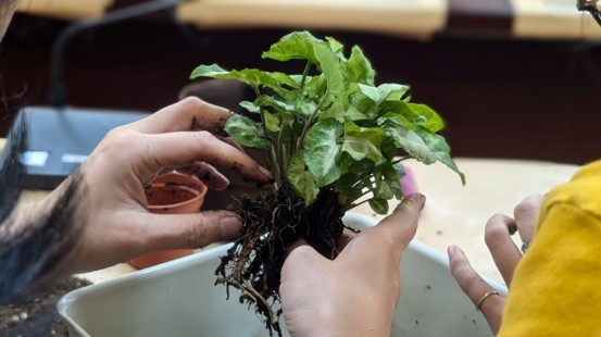 臺大醫院健康大樓的公共藝術計畫以「重啟對話」為核心精神,邀請民眾透過參與式創作與教育推廣,重新思考藝術、自然、城市與生命之間的關係,讓人們在感官、記憶與自然的交織中,開啟多重的健康之路。公共藝術的特質在於因地制宜,不僅止於外在環境空間的美化裝飾,更重視與場域、時間和人群的深度連結。本案藝術家以駐地創作的精神,浸潤於醫院環境與生活的脈動,將觀察與感受轉化為能引發共鳴的創作形式。 自然之律:在綠意中調頻,回到完整 「自然之律」提醒我們,大自然蘊含著與身心共振的頻率。劉雨青《自然校準綠回歸—來帖綠色處方箋》透過植物的多元面貌與療癒特質,讓參與者以觸摸泥土、感受香氣、欣賞造型等具體行動重新調頻,釋放壓力並獲得能量。這些感官的開啟讓人回到原始的平靜;即使身處都市,綠意與自然的陪伴仍能成為支持,使人重新找回完整性。