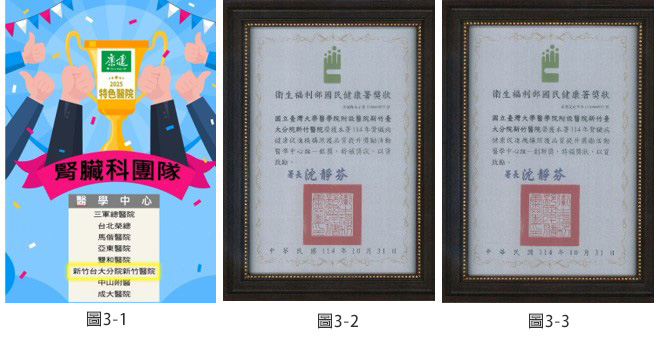 除了控制三高(高血糖、高血壓、高血脂)外,應積極從日常生活中落實護腎行為,如戒菸、規律運動(建議每週達150分鐘以上的中度身體活動),和維持理想體重(BMI介於18.5至24.9kg/m2之間)。要養成良好的營養飲食習慣,採取均衡飲食,並配合醫護團隊提供的健康飲食衛教諮詢。對於慢性腎臟病的高風險族群,應特別注意避免吸菸、體重過重、長期使用止痛藥(如NSAIDs)或具潛在腎毒性的藥物,最好減少使用草藥的機會。 五、本院推廣成效及肯定 (一)榮獲2025年康健雜誌評選為醫學中心之特色醫院(圖3-1)。